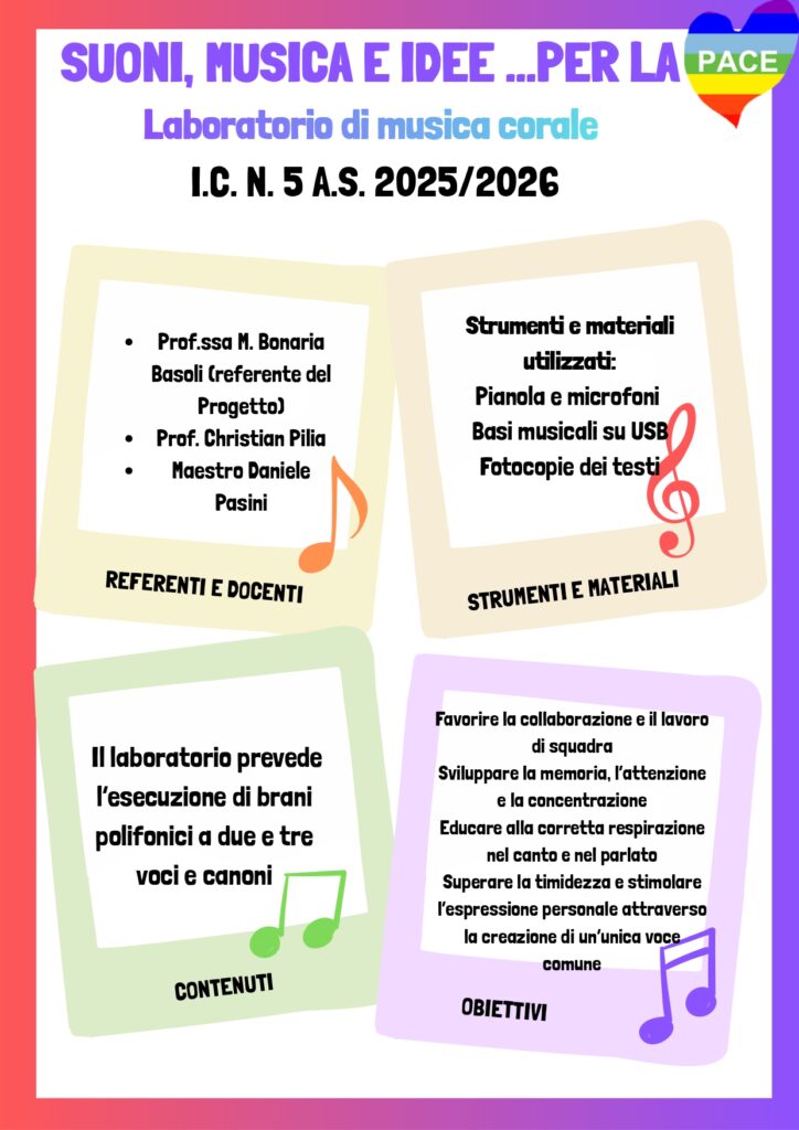 Si parte con il Laboratorio di Musica Corale, inserito nel progetto “Suoni, Musica e Idee… per la Pace”, finalizzato a promuovere la collaborazione, l’espressione di sé e il valore della musica come strumento di unione e condivisione.